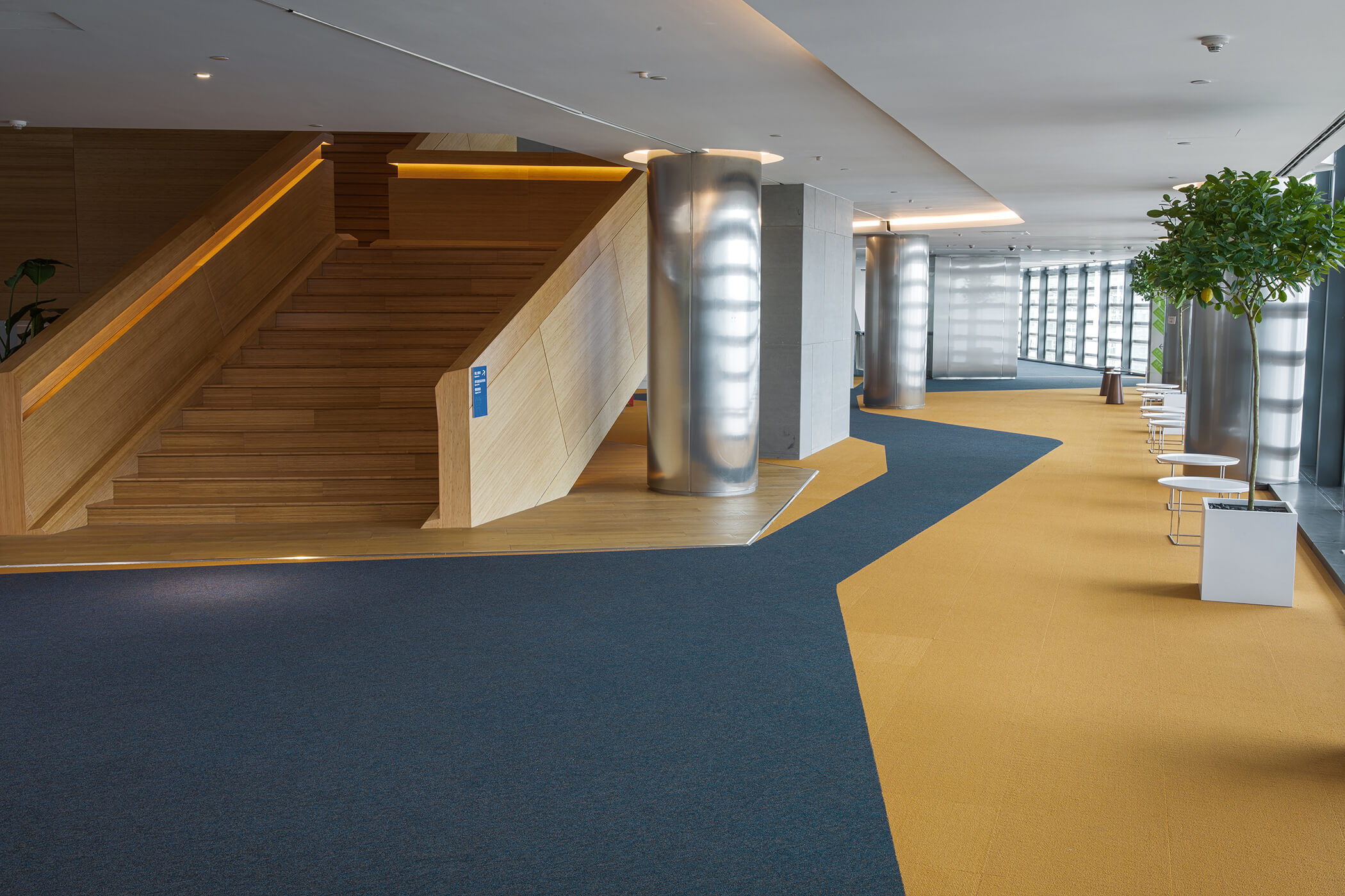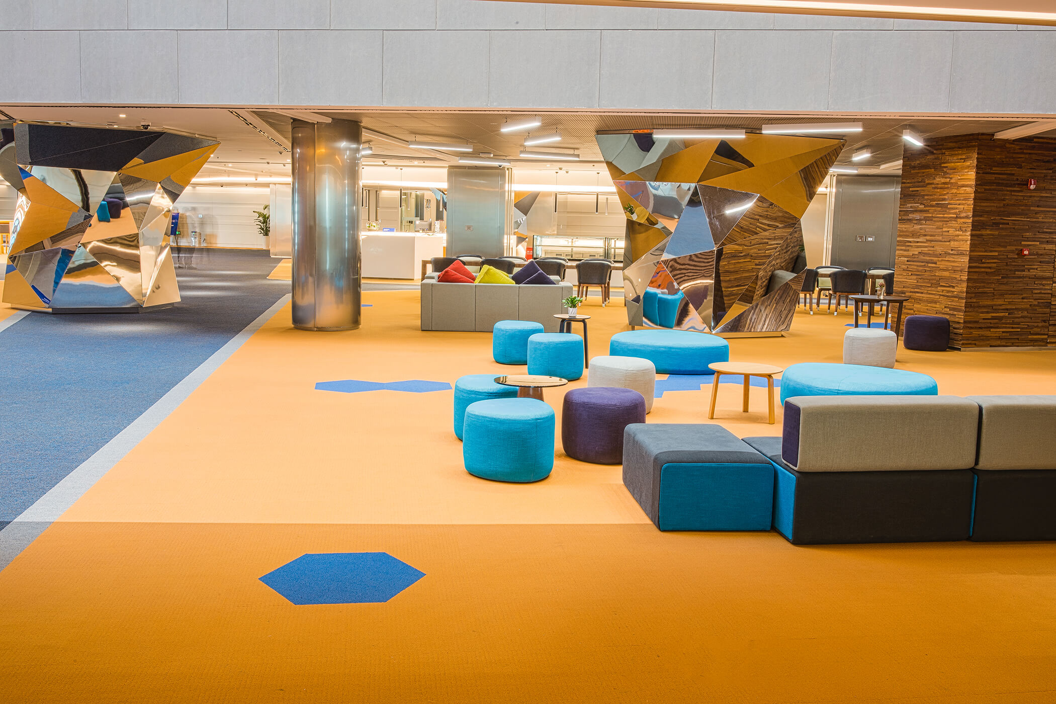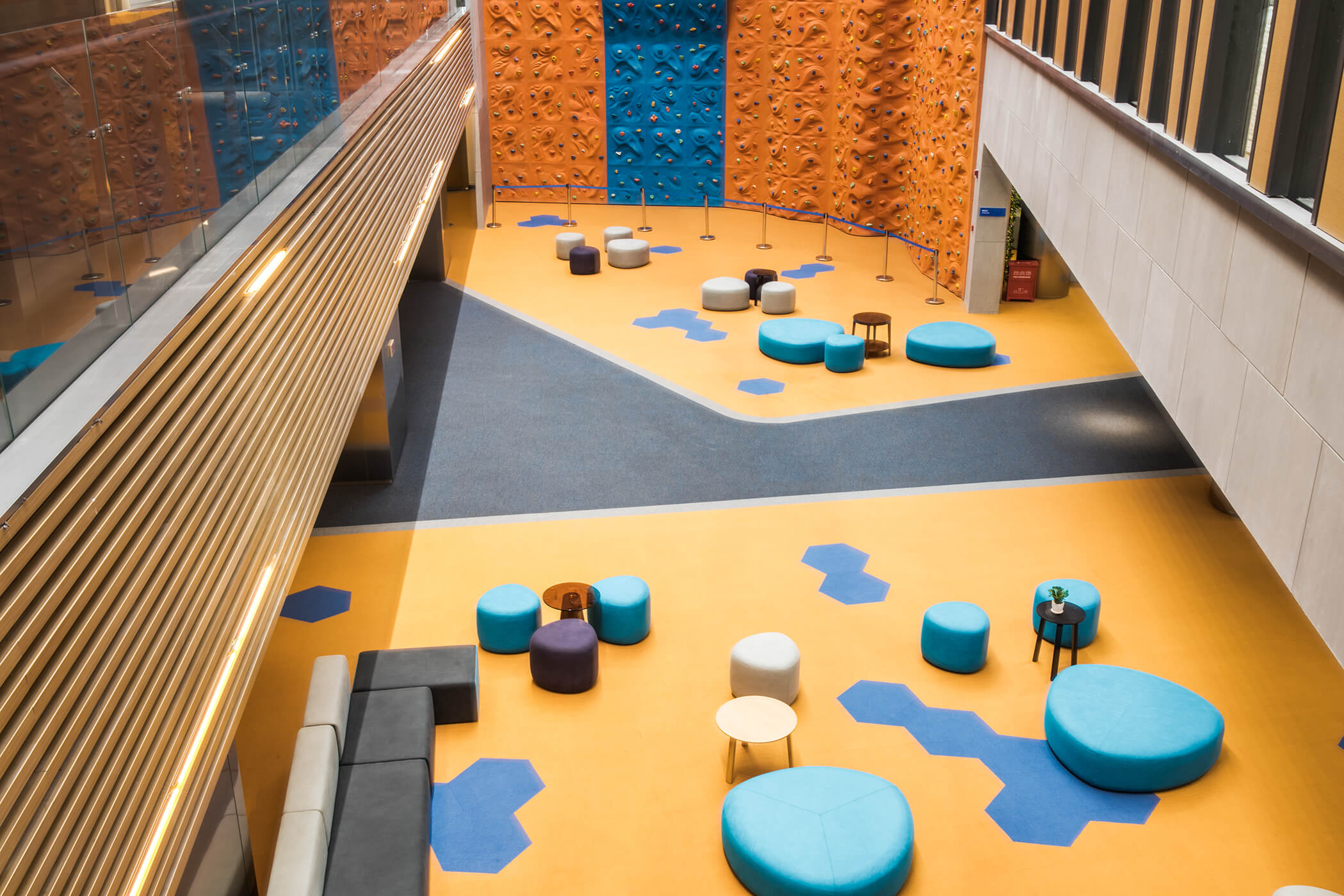 The core vision of this project is to cultivate an environment that is both efficient and vibrant, fostering community interaction and the spark of inspiration. Accordingly, the flooring design draws from the natural morphology of honeycombs, integrated with the art of geometric tessellation. By combining hexagonal and polygonal elements in a diverse palette, it has created a dynamic visual effect and a rich sense of spatial layering. This not only imbues the space with a modern edge but also fills it with artistic soul and visual intrigue.