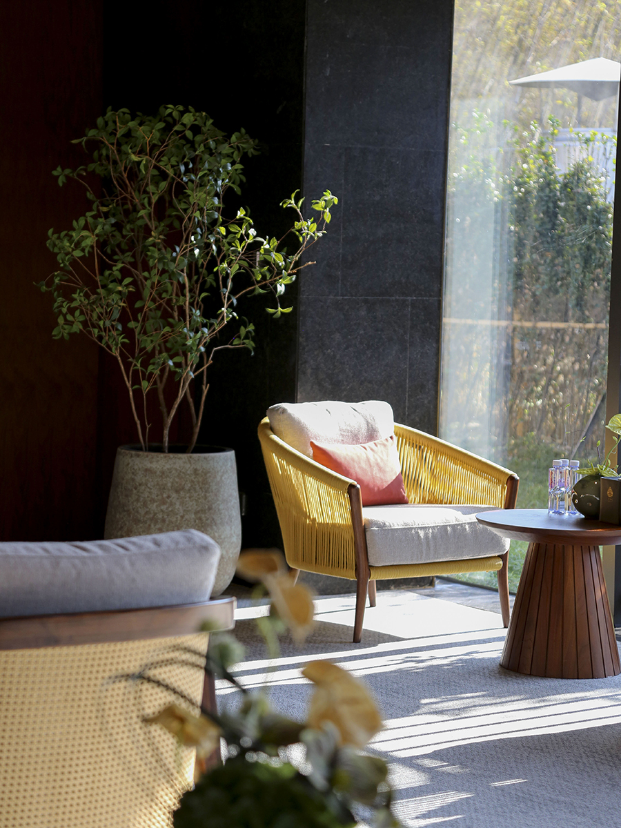 一楼为温泉区。步入汤池前,这里精细打造了一个颇具禅意的休闲空间。与之相配,我们选用了T601 Torrent。其割绒工艺带来了细腻丰盈的质感与柔和雅致的光泽,提升了空间的温润感与高级感。