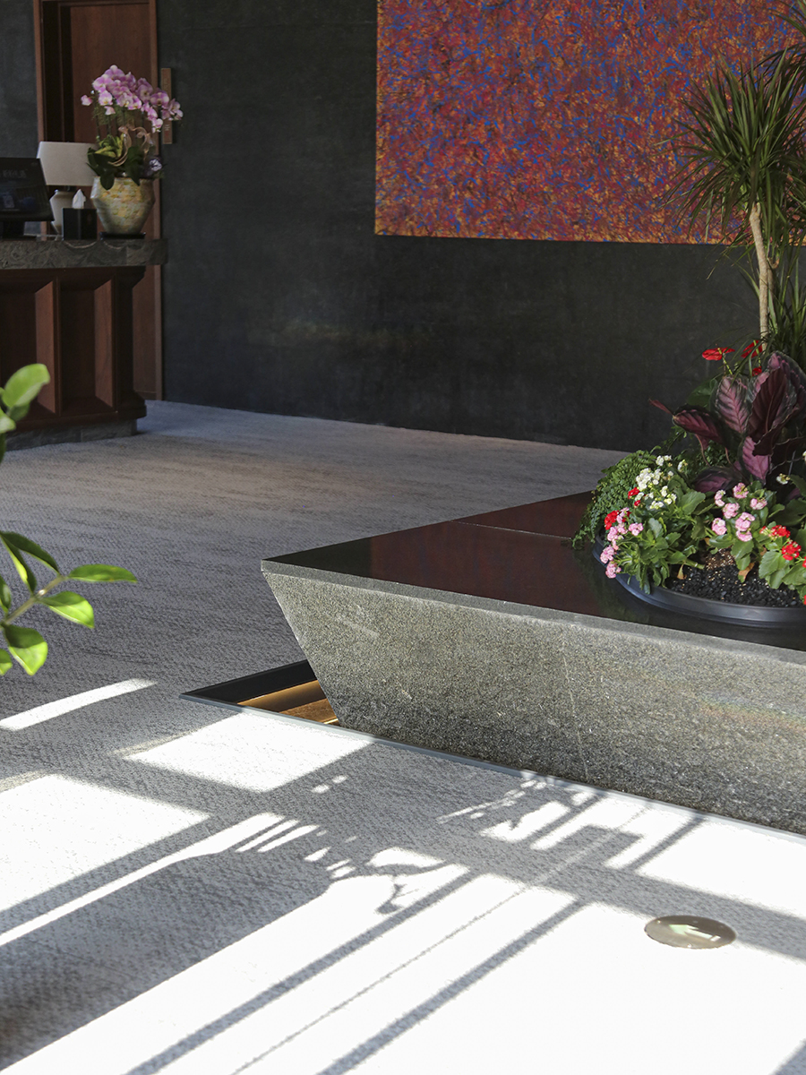 上到二楼。这里是专为宾客打造的SPA与休息区。这里我们选用了T665 Granite以营造宁谧舒缓的休憩氛围,大理石的纹理与周围环境融为一体。它帮助客人从温泉的热闹中逐渐沉静,陪伴他们步入当下的修养时刻,实现身心的深度放松。