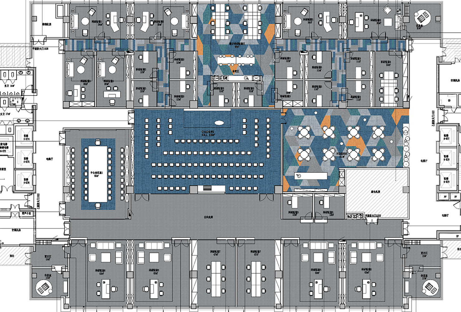 The active zones, including casual lounges and discussion areas designed to foster communication and creativity, boldly incorporate high-saturation orange. These vibrant orange blocks act as visual focal points, stimulating innovative vitality and a desire for interaction. Meanwhile, stable blue and neutral gray domains serve as the grounding base, balancing the overall energy and preventing excessive visual noise.